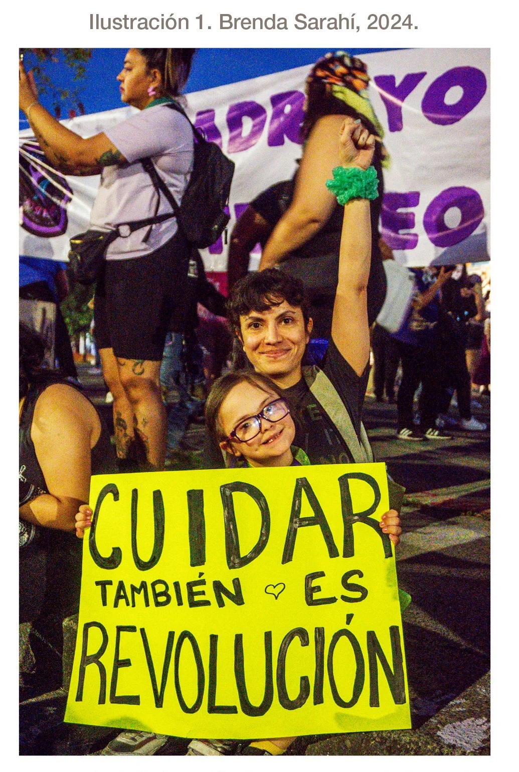 Por otro lado, hubo múltiples expresiones de lo que llamamos en el apartado anterior, diálogo intergeneracional: “Los niños, marchando, también están luchando”, “Fui la niña que tocaron sin su consentimiento, pero soy la tía de la niña que jamás vas a tocar”, “Cuidar también es revolución” (ilustración 1). También se hicieron presentes consignas que reflejan la interseccionalidad, respecto a participantes con discapacidad: “Mujeres con discapacidad: presentes no invisibles”, “Hoy venimos más válidas que nunca”, “Mi silla, mi cuerpo, mis reglas” (Tapatías con discapacidad, 2024) y de la diversidad sexual: “No seguiré ideologías que excluyan a mis amigas trans” (Notas de campo, marzo de 2024).